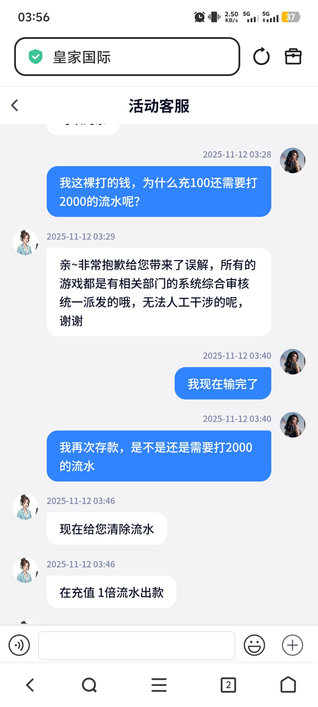 这辈子没有见过这么恶心人的台子,上面跟我说他干预不了这个流水,是系统审核的,下面我输完了跟我说,我现在给您清流水,我真操你妈了我他妈还用你清吗操死你全家了